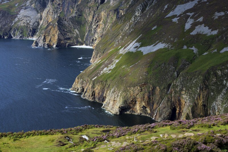 Slieve League liegt an der Südwest-Küste Donegals, westlich von Killybegs. Die Klippen bieten atemberaubende Ausblicke auf Land und Meer. Während des Sonnenuntergangs verfärben sich die Klippen teilweise rot, ocker oder orange. Ein fantastisches Farbenspiel!