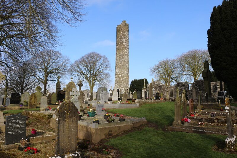 Die von frühmittelalterlichen Steinmetzen bearbeiteten Flächen zeigen Szenen vom Sündenfall bis zum Jüngsten Gericht. Zudem befindet sich auf dem Gottesacker einer der höchsten Rundtürme Irlands mit einer Höhe von 33,5 Metern. Dabei erinnert der 1000 Jahre alte Bau etwas an den Schiefen Turm von Pisa, denn er neigt sich leicht zur Seite. Schon zu Bauzeiten hatte sich der Untergrund des Mauerwerks sichtbar gesenkt. Seine fünf Stockwerke sind nur über Leitern zu erreichen. Hier bewahrten die Mönche ihre Bücher und kostbaren liturgischen Geräte auf.
