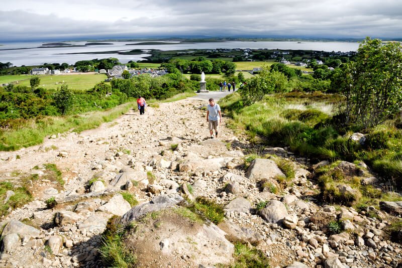 Der beschwerliche Aufstieg, der um Mitternacht von Murrisk Abbey über die Nordseite des Berges beginnt, verschlingt gut und gerne vier Stunden. Entschädigt wird der Pilger dafür bei klarer Sicht mit einem herrlichen Ausblick auf Mayo, die Twelve Bens in Connemara und die Atlantikküste. Als eine besondere Augenweide erweist sich dabei die Clew Bay mit ihren mehr als 350 Inseln.