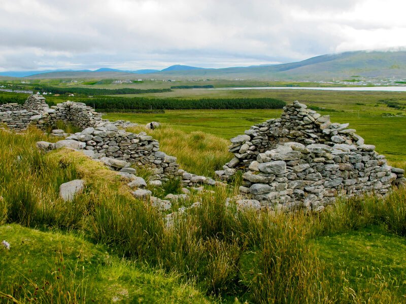 In der Tat erstrecken sich die über 80 Ruinen wie ein Rückgrat entlang des Südhangs des 671 m hohen Berges Slievemore.