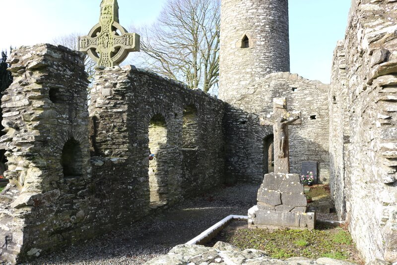 Beide sind mehr als 1.000 Jahre alt und dienten ursprünglich als steinerne Bilderbibeln bei Gottesdiensten. Die von frühmittelalterlichen Steinmetzen bearbeiteten Flächen zeigen Szenen vom Sündenfall bis zum Jüngsten Gericht. Zudem befindet sich auf dem Gottesacker einer der höchsten Rundtürme Irlands mit einer Höhe von 33,5 Metern. Seine fünf Stockwerke sind nur über Leitern zu erreichen. Hier bewahrten die Mönche ihre Bücher und kostbaren liturgischen Geräte auf.